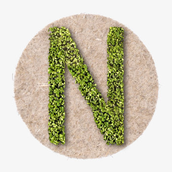Letter M made from plant seeds applied to eco-friendly natural fibre pads.
